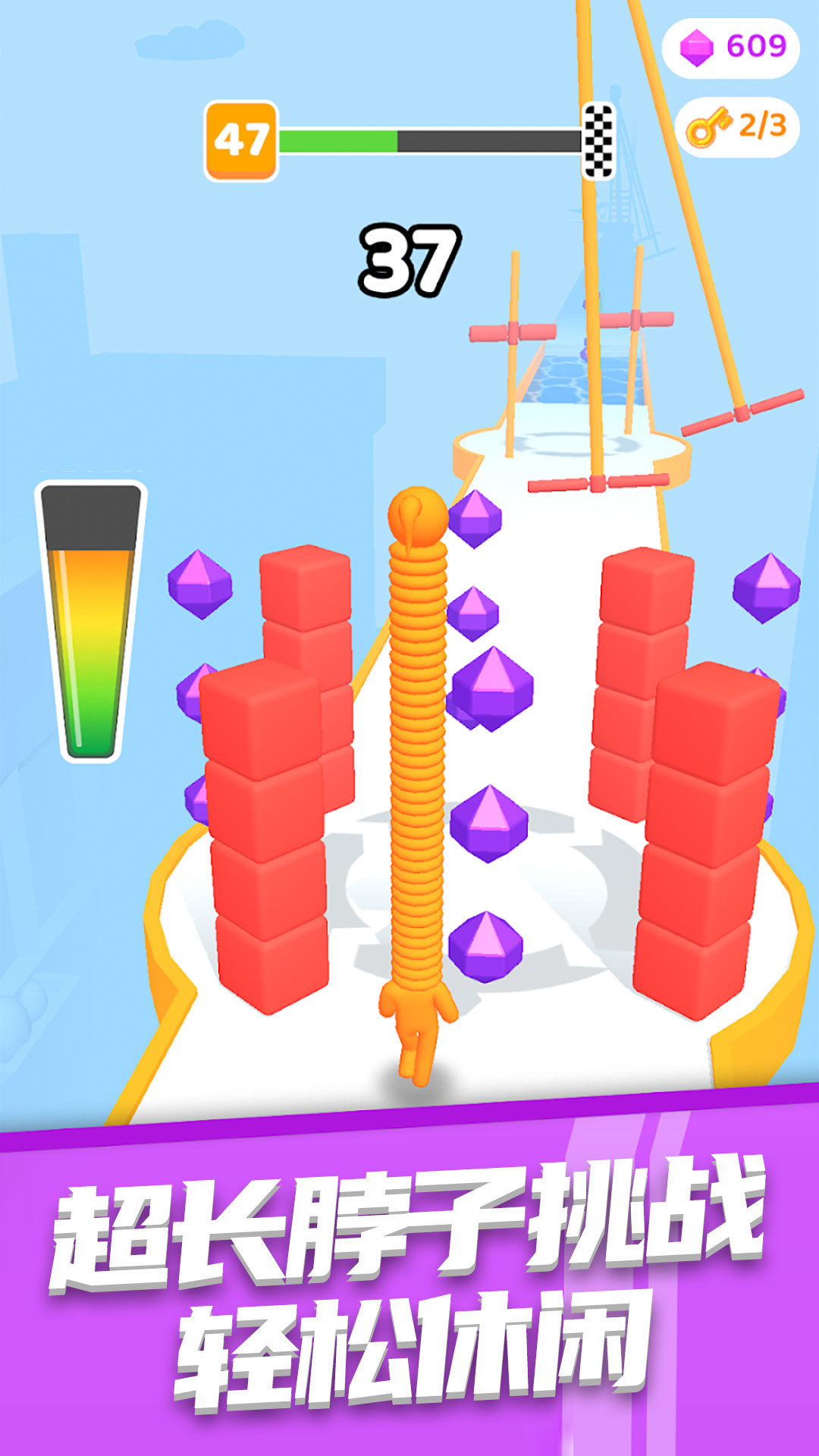 1. 玩家通过左右滑动屏幕来控制高个子角色的左右移动,躲避赛道上出现的各种障碍物。