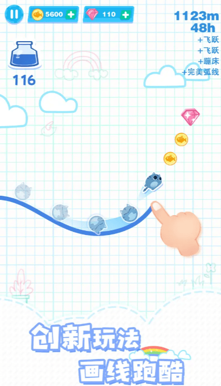 1. 创新画线玩法:喵上云霄打破了传统跑酷游戏的固定操作模式,采用画线操控猫咪跑酷的方式,增加了游戏的互动性和趣味性。
