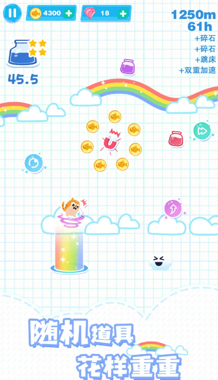 2. 游戏目标:帮助猫咪顺利到达云霄之上,途中需要收集金币并解锁各种游戏道具。