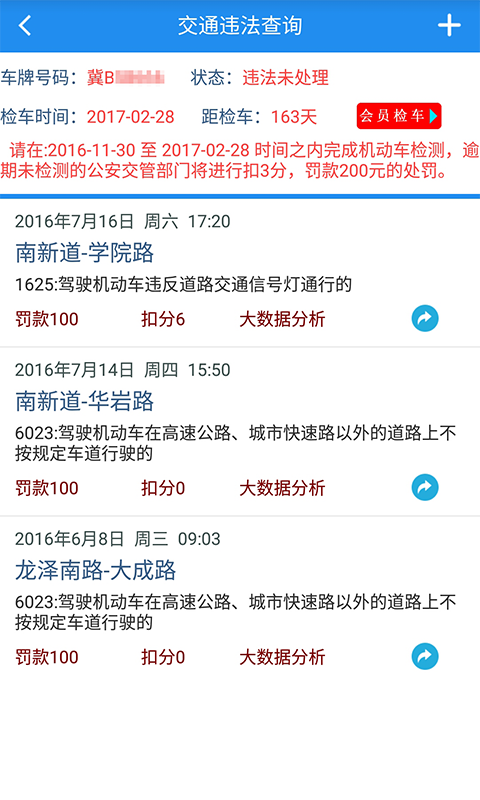 3. 违章查询功能输入车牌号等即可迅速获取违章详情。